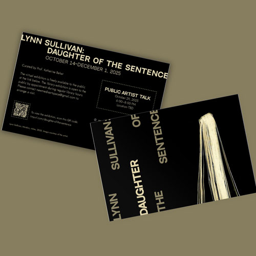 Lynn Sullivan: Daughter of the Sentence is curated by Katherine Behar, Professor in the Fine and Performing Arts Department in the Weissman School of Arts and Sciences, Baruch College, CUNY and is produced by the New Media Artspace Student Docent Team. The exhibition is made possible by further support from the Student Technology Fund (STF), the Baruch Computing and Technology Center (BCTC), the Weissman School of Arts and Sciences, and the Newman Library. All images appear courtesy of the artist.