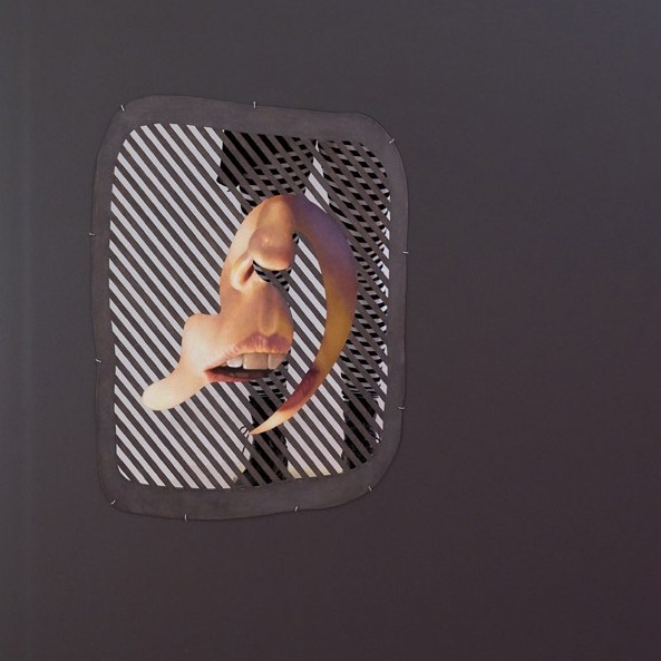 In a grey rectangular field, two orifices—a painting of a mouth and a painting of an ear—float in nondescript neutrality. Against the tall monolith, the paintings’ frames are crudely cut, offering oases of irregularity in the noncolor of nonspace. Their improvised edges contrast the meticulous rendering of flesh, of teeth, of close-cropped silver hair, a tantalizing tuck of an earlobe, a highlight twinkling a nose tip. These intimately observed fragmented features are interrupted by voids. The paintings are cut full of holes, with perfectly parallel diagonal stripes staking their surfaces, punctuating their cavities, creating negative space in a physical sense, and marking it as such. Are these images meant for seeing or for seeing through? This is the performance’s set.